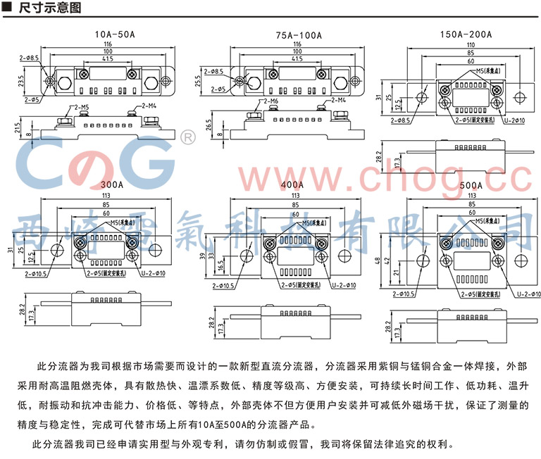 分流器广泛用于扩大仪表测量电流范围,有固定式定值分流器和精密合金电阻器,均可用于通讯系统、电子整机、自动化控制的电源等回路作限流,均流取样检测.为确保给客户提供优质的产品,公司选用优质锰铜合金片,该产品采用铜银磷焊料,电阻接触焊,熔接焊接可靠加工工艺,每只产品均经严格测试筛选才出厂。